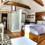 Inside, the home features high ceilings with beautiful exposed wood beams, modern finishes, and plenty of natural light. Guests can snuggle into the comfortable queen-size bed and read a book or stream their favorite shows on the Smart TV. Beside the entrance, there are hooks for coats and bags, as well as a sitting area with two lounge chairs and a coffee table. There is a walk-in glass shower outside of the bathroom in the main area of the home, and the bathroom has a spacious wooden vanity.