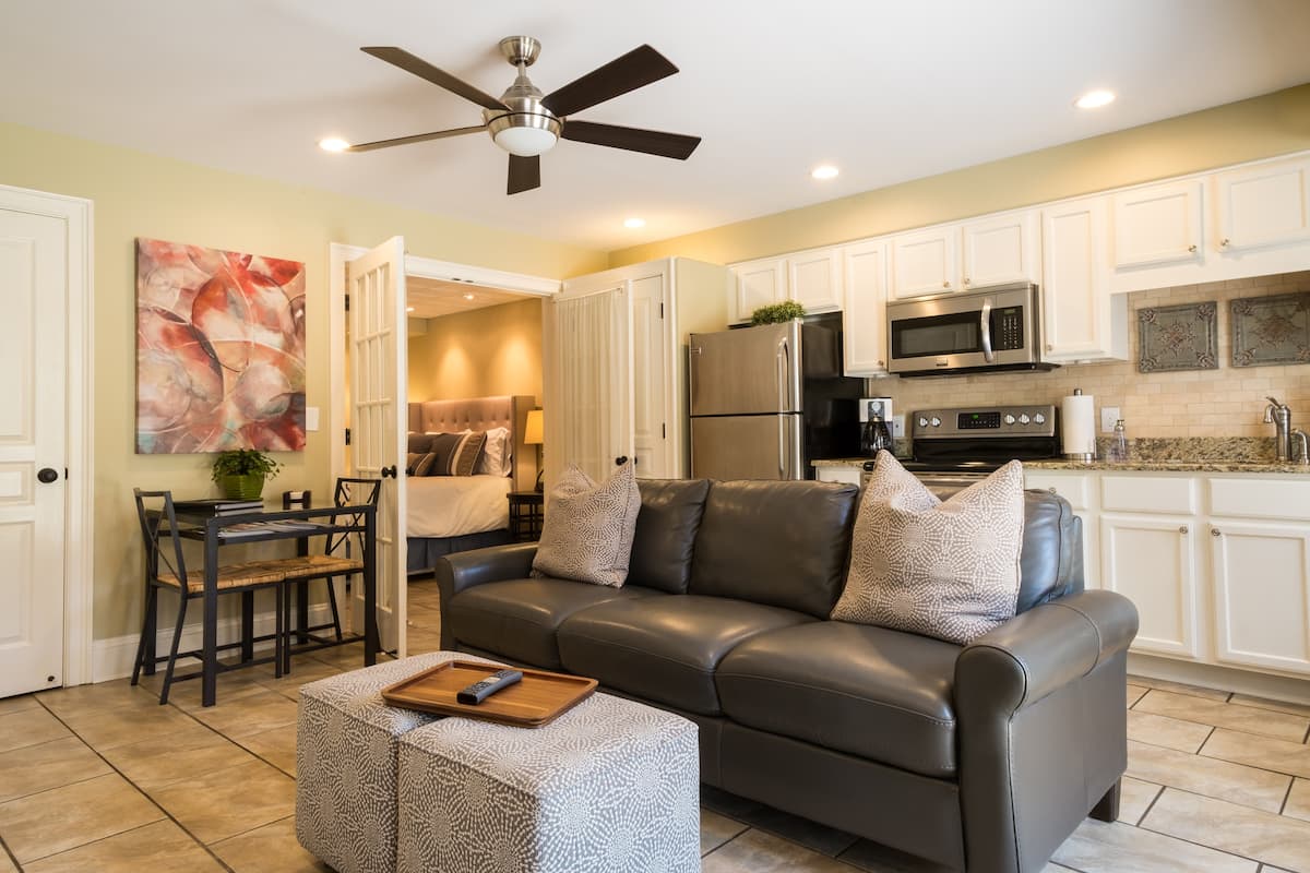 This inviting apartment occupies the ground floor of the home belonging to superhosts Craig and Joey, but it’s completely separate from the rest of the house. With no stairs in the apartment or leading to its private entrance, it’s ideal for those with accessibility needs. It also boasts a full kitchen and plenty of space, so you’ll have everything you need to be comfortable here.