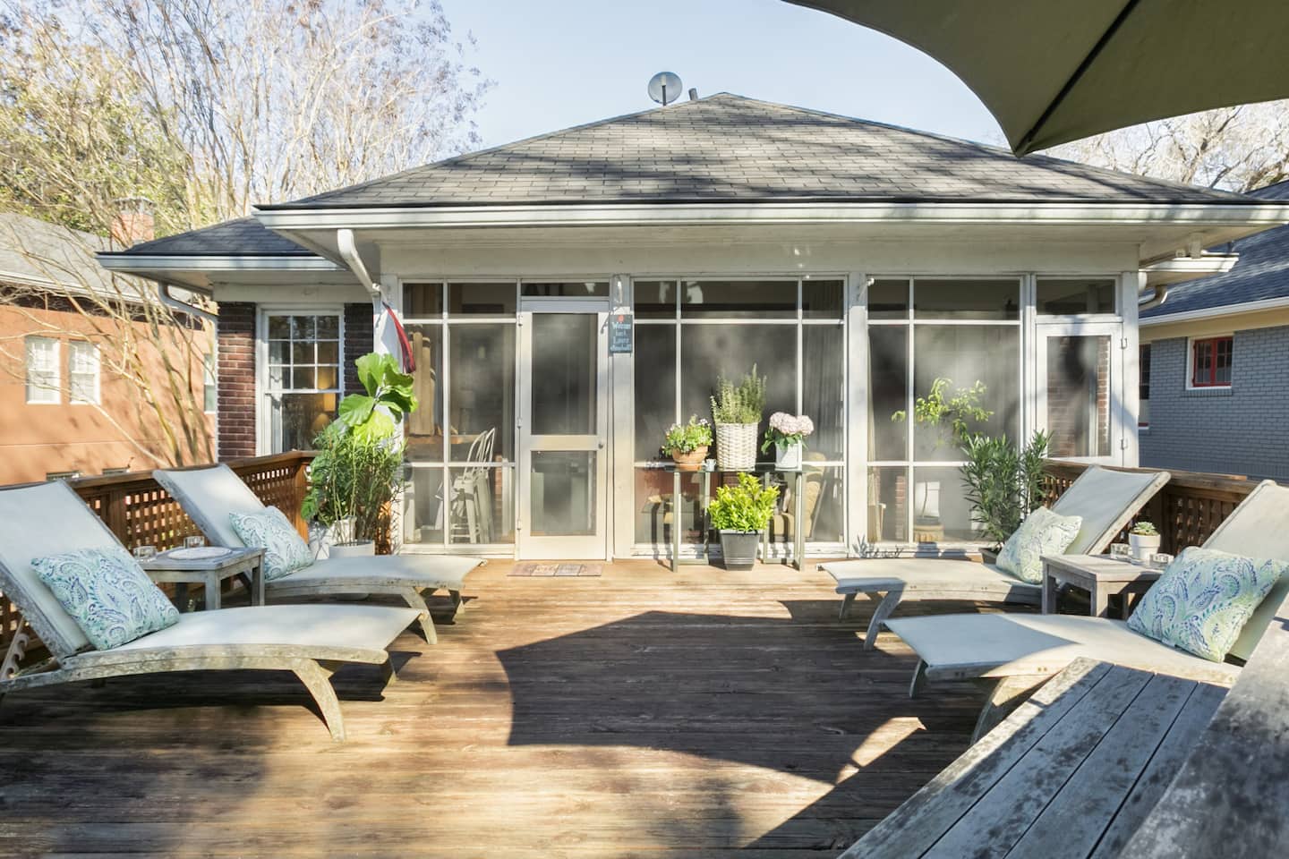 This Atlanta Airbnb Plus makes up for its lack of space with comfort and practicality. Best suited to couples or solo travelers, the suite has a modern bedroom with a queen bed. You can unwind on the private screened porch in lieu of a traditional living room, or head out onto the large patio with sun loungers and an umbrella. The views of the city skyline are a nice bonus of the patio.