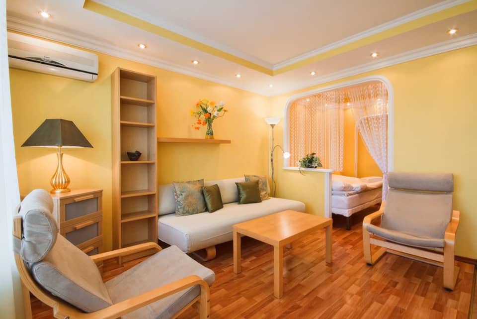 The interior is warm and bright with cheerful yellow walls and wooden furnishings. There is one private sleeping nook separated from the living room by a curtain and furnished with a king-size bed. The living room also comes with a comfy sofa bed for additional guests. Step onto the screened-in balcony to enjoy breathtaking views of the Kremlin and the Russian Revival architecture of the Cathedral of Christ the Savior. The apartment is also equipped with a private full bathroom and a fully stocked kitchen that comes with a complimentary fruit basket and bottle of wine.