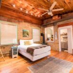 This building was once home to the historic Baldwin Radio Factory that produced the world’s first headphones. This rustic and art-inspired space is now converted and allows up to four guests plus their furry friends to stay. The tiny cottage boasts a unique aesthetic with exposed brick walls and beautiful hardwood floors. There is one queen-size bed beside the woodstove and one sofa bed. The kitchen has a microwave, a minifridge, and a coffee maker as well as a small eating counter. The bathroom is located in the kitchen; however, curtains are hung in front of the shower and toilet to provide privacy.