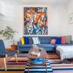 With four bedrooms and two full bathrooms, this beautifully appointed rental is the perfect choice for large families and groups of friends with up to eight guests. The impressive interior is decorated with colorful artwork and unique vintage accents, and the light-filled living area is characterized by a bright orange accent wall, a large dining table with turquoise chairs, and a full wall of glass overlooking the city. There is also a full kitchen with a complete selection of modern appliances, including a dishwasher, and guests have access to a utility room with a washer and dryer. The rental also comes with a shared pool and a grilling area, and there is a private balcony accessible though the living room and the master bedroom.