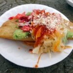 Enchilada / Tostadas – Tortilla jagung goreng (olahan/buatan pabrik) dengan guacamole, kacang hitam goreng, saus tomat, atau pollo dan topping lainnya